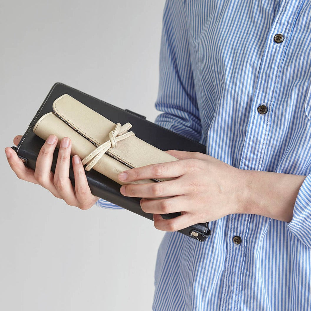 柔らかくふかふかとした素材感を味わえる、上質なソフトシュリンクレザーを採用した巻きペンケース。