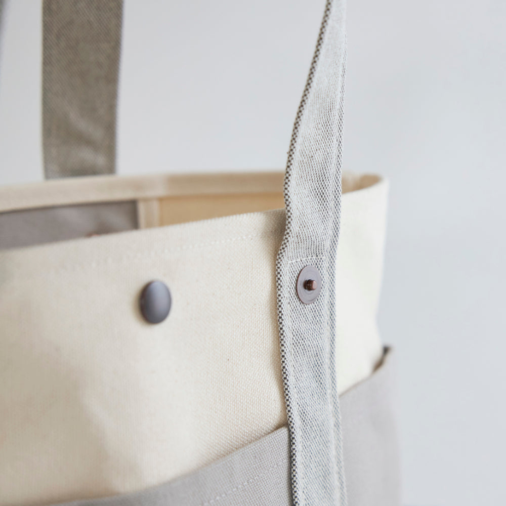 ハンドル・ハカマ部分には、ヨコ糸にチャコールグレー糸を使用したシャンブレー帆布を使用しています。