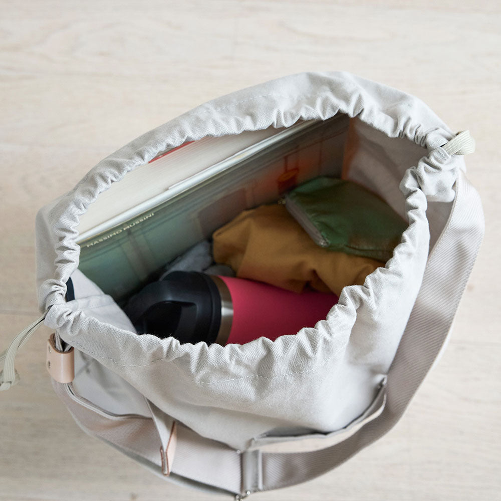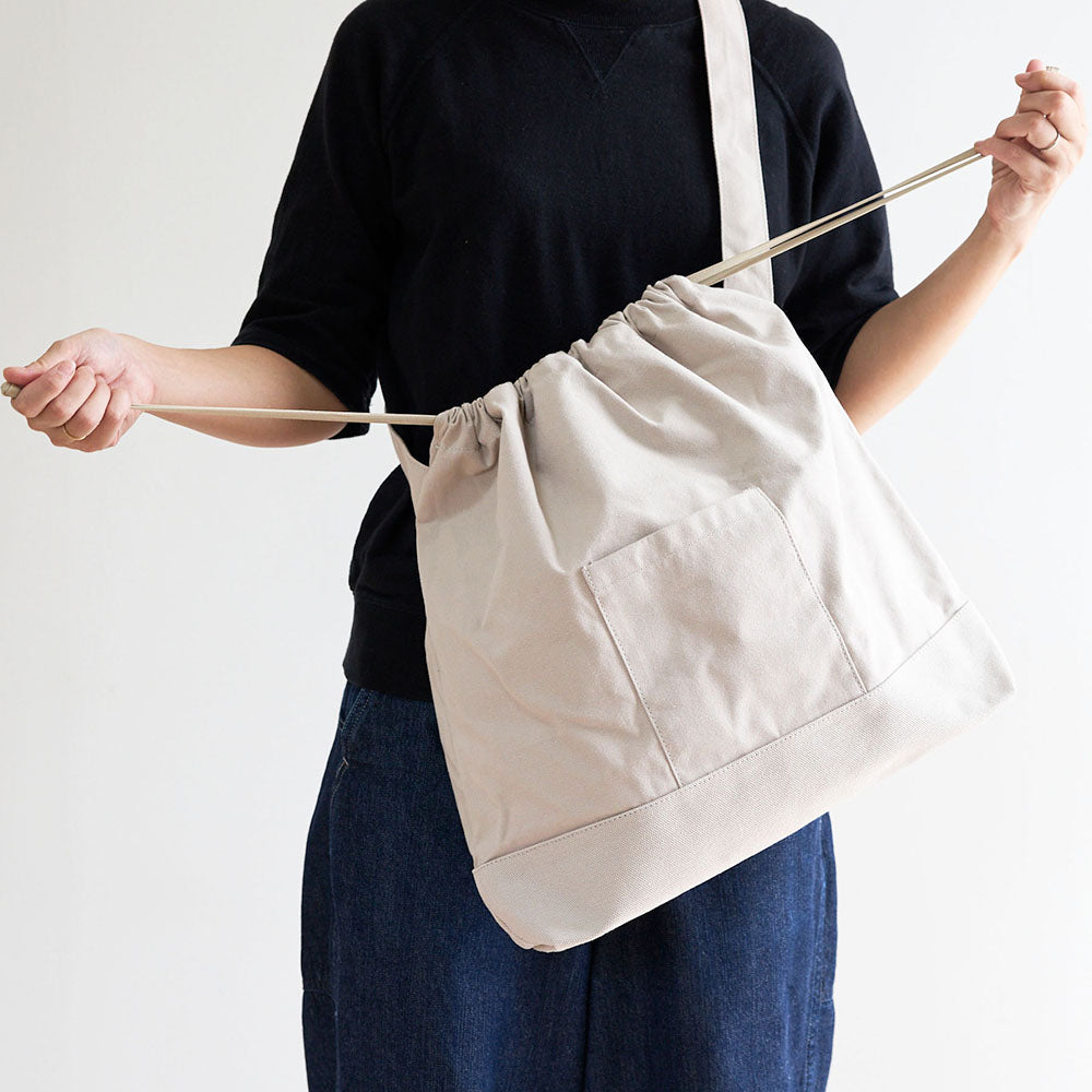 大容量の巾着バッグLは、着替えや2Lのペットボトルが入るサイズ感。